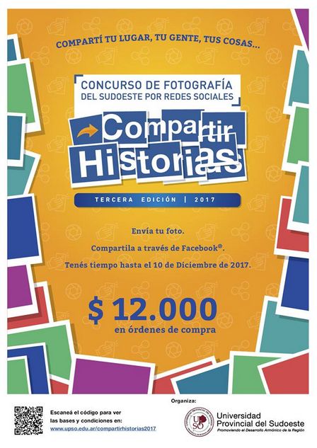 Esta convocatoria está abierta a residentes del Sudoeste de la Provincia de Buenos Aires, y tiene por objetivos estimular la creatividad, propiciar las producciones artísticas independientes, divulgar aspectos vinculados con el entorno, promover la difusión y conservación del patrimonio cultural y fomentar la identificación Regional. Se recibirán fotografías hasta el Domingo 10 de Diciembre de 2017. El tema del Concurso es “Compartir Historias”, tu gente, tu lugar, tus cosas, mediante una fotografía.