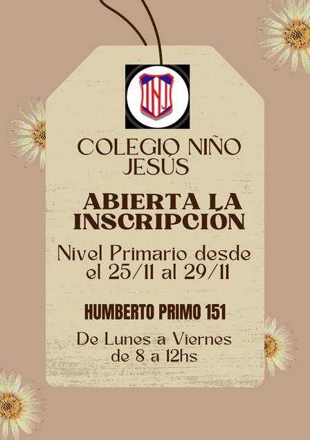 En calle Humberto Primo 151 de la ciudad de Pigüé el Nivel Primario del Colegio Niño Jesús inscribirá de 8.00 a 12.00 horas.