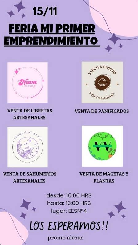 La feria se llevará a cabo mañana, viernes, 15 de noviembre de 2024, desde las 10.00 hasta las 3.00 horas, en la Escuela de Educación Secundaria Número 4 a cargo de los integrantes de la Promo Alesus de Arroyo Corto.