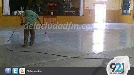 En la Escuela Primaria Número 8 de Espartillar están realizando trabajos de pintura sobre el piso del Salón de Usos Múltiples.