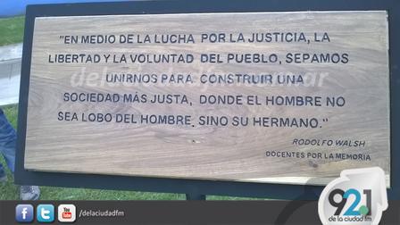 Allí puede observarse una frase de Rodolfo Walsh que fue provista por el grupo de Docentes por la Memoria.