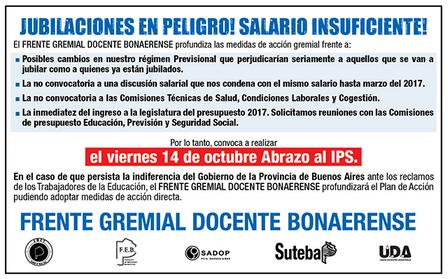 El Frente Gremial Docente Bonaerense afirma que "profundiza las medidas de acción gremial frente a posibles cambios en nuestro régimen Previsional que perjudicarían seriamente a aquellos que se van a jubilar como a quienes ya están jubilados, la no convocatoria a una discusión salarial que nos condena con el mismo salario hasta marzo del 2017.