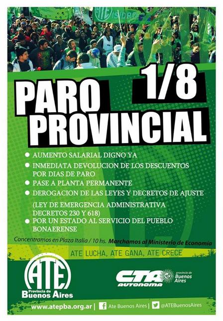 ATE realizará un paro provincial de 24 horas este lunes próximo.