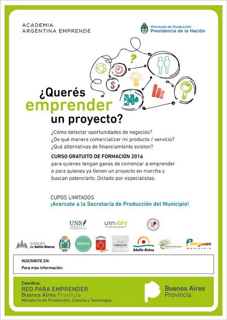 En el Programa de Capacitación se trabajará la generación y evaluación de ideas de emprendimientos; costos e ingresos de proyectos; marketing y canales de comercialización; presentación de proyectos entre otros temas. Además se dispondrá de un capacitador que les brindará a cada emprendedor o asistente, asesoramiento en cada uno de los temas tratados en el curso. Los cupos son limitados y tendrá una duración de 9 encuentros, 6 de ellos serán presenciales y se realizarán en los municipios mencionados. Habrá 2 instancias regionales a desarrollarse en la ciudad de Bahía Blanca.