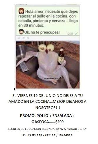 En la Escuela Secundaria Número 5 'Miguel Bru' están vendiendo un pollo + una ensalada + una gaseosa a 200 pesos.