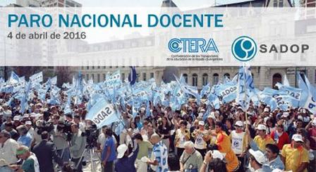 Los educadores, nucleados en la Confederación de Trabajadores de la Educación (CTERA) y en el Sindicato Argentino de Docentes Privados (SADOP), paramos por 24 horas y nos concentramos frente a la Casa de Mendoza (Avenida Callao y Avenida Corrientes) el lunes 4 de abril a las 12 horas para luego marchar al Ministerio de Educación de la Nación".