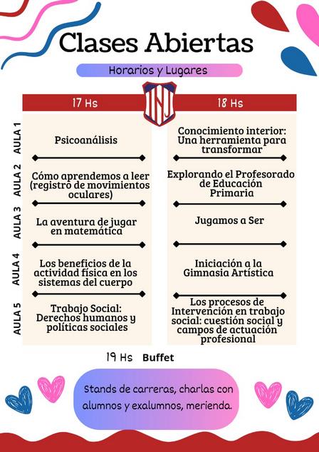 En cinco aulas habrá actividades especiales, tanto a las 17.00 horas como a las 18.00, en Avenida Rastreador Fournier 297 de Pigüé, para complementar las propuestas que a la vez podrán seguirse de cerca en los stands de las carreras, las charlas con alumnos, y la merienda compartida.