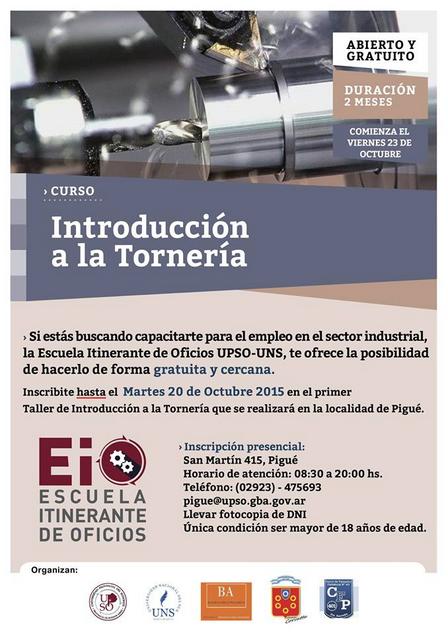 Esta actividad es la que comenzará el viernes 23 de octubre en la localidad de Pigué con nueve jornadas de cuatro horas a dictarse los días viernes por la tarde, en los que se brindarán las nociones básicas para el uso del torno, con prácticas en la Base de Apoyo Logístico Ejército. La inscripción puede realizarse de forma gratuita hasta el día martes 20 de octubre en la Sede UPSO de San Martin 415, Pigüé.
