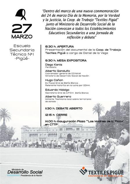 Dentro del marco de una nueva conmemoración del 24 de marzo Día de la Memoria, por la Verdad y la Justicia, la Cooperativa de Trabajo Textiles Pigüé Limitada, junto al Ministerio de Desarrollo Social de la Nación, llevará a cabo una actividad especial.