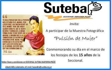 SUTEBA presentó una invitación para participar en la muestra fotográfica "Pulsión de Mujer" en conmemoración al Día Internacional de la Mujer y en el marco de los festejos por los 15 años de la Seccional en el Distrito.