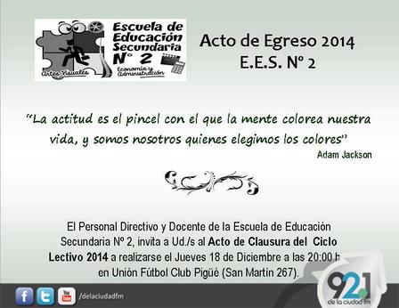 El personal directivo de la Escuela de Educación Secundaria Número 2 de Pigüé confirmó que el acto de clausura del ciclo lectivo se realizará el jueves.