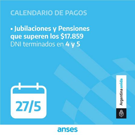 Este miércoles 27 de mayo las entidades bancarias atenderán el pago correspondiente a mayo de jubilaciones y pensiones mayores a $17.859 con DNI terminados en 4 y 5