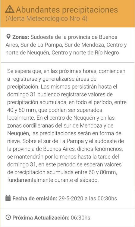 Hasta esta mañana continúa la emisión de la advertencia para la zona del Sudoeste de la Provincia de Buenos Aires.
