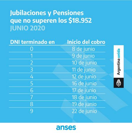 Rige para el lunes 8 de junio el primer pago anunciado, para mayo, tanto en jubilaciones como en pensiones.