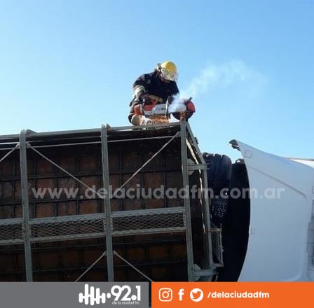 El vuelco de un camión jaula hizo que los Bomberos, con elementos cortantes, liberen la estructura para sacar del transporte a los animales que estaban siendo trasladados.