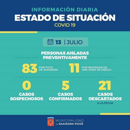 Es el estado de situación al 13 de julio que da cuenta de la permanencia de cinco casos con Covid19.