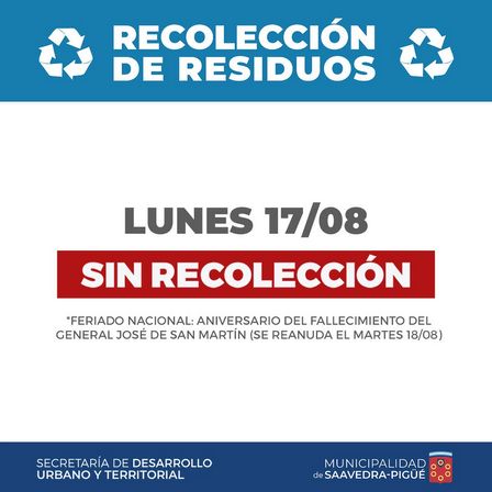 Por el feriado del paso a la inmortalidad del General José de San Martín no habrá actividad para los recolectores el lunes por la noche.