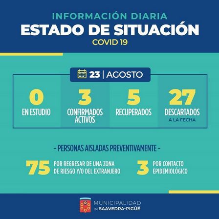 Tampoco hay nuevos casos confirmados de Covid19 en el Partido de Saavedra.
