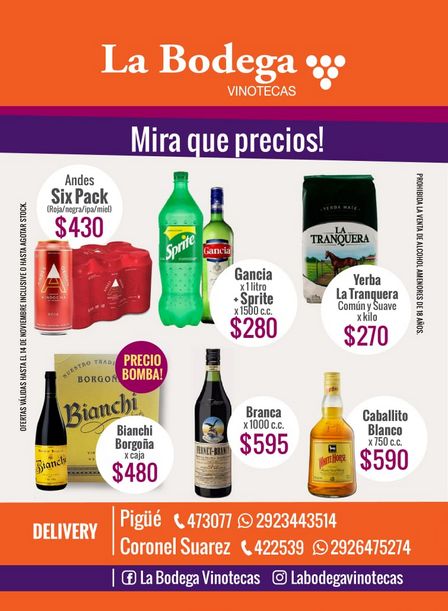 La Bodega Vinotecas tiene un litro de Gancia más una botella de litro y medio de Sprite a 280 pesos, y la botella de whisky Caballito Blanco de 750 cc. a 590 pesos.
