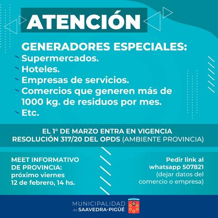 El Municipio de Saavedra Pigüé confirmó que el primero de marzo ingresará en vigencia una resolución del Organismo Provincial para el Desarrollo Sostenible orientada a los generadores especiales de residuos.