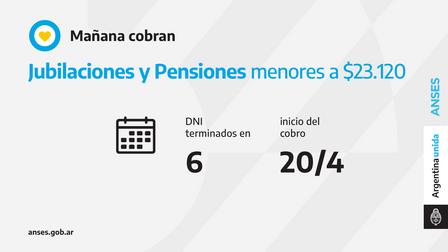 Las sucursales bancarias habilitadas atenderán por ventanilla a jubilados, jubiladas, pensionados y pensionadas con documentos terminados en 6 cuyos haberes no superen la suma de 23.120 pesos.