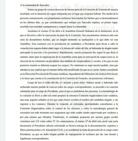 El mensaje dice "A la comunidad de Saavedra: Somos un grupo de vecinos deseosos de formar parte de la Comisión de Fomento de nuestra localidad, con la intención de seguir trabajando por el lugar que elegimos habitar. Por medio de la presente comunicación, nos proponemos esclarecer brevemente los hechos que se desencadenaron