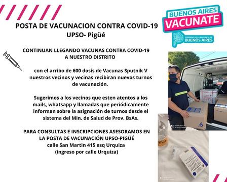 La Posta de Vacunación está desarrollando las aplicaciones en el espacio de Urquiza esquina San Martín de Pigüé.