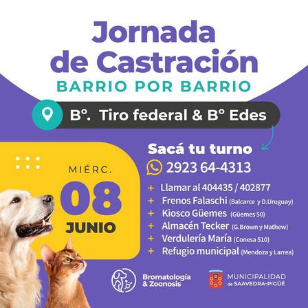 Personal de Bromatología & Zoonosis estará, el miércoles, 8 de junio, por la mañana, realizando castraciones en el Barrio EDES y en el Barrio Tiro Federal de Pigüé.