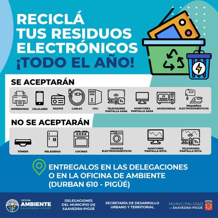 Los Residuos de Aparatos Eléctricos y Electrónicos pueden ser entregados ahora en las Delegaciones Municipales o en la Oficina de Ambiente ubicada en Monseñor Durban 610 de Pigüé).