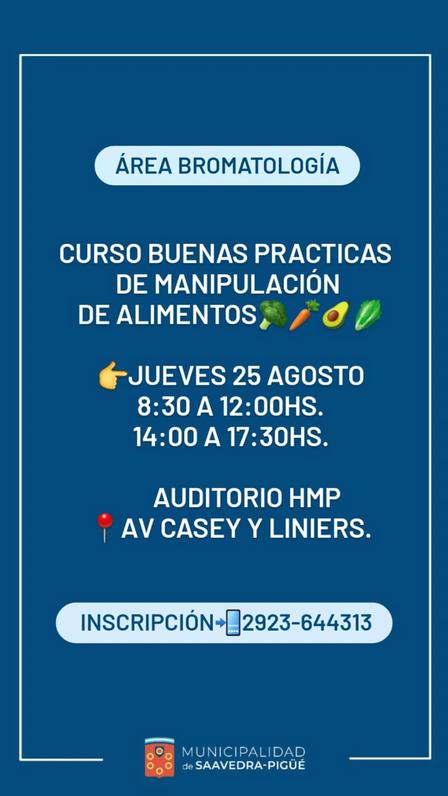 El Área de Bromatología está anotando a quienes quieran participar de esta capacitación anunciada para el jueves 25 de agosto en el Auditorio del Hospital Municipal.