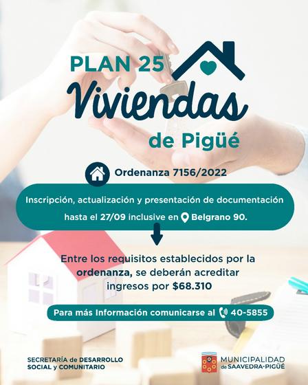 Para participar de la asignación del Plan 25 Viviendas de la localidad de Pigüé los anotados que cumplan todos los requisitos serán parte de un sorteo, previsto para el día 3 de octubre, a las 10.00 horas.