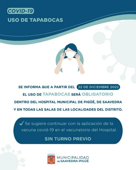 Desde el día de hoy, jueves 22 de diciembre, es obligatorio el uso del tapabocas en el Hospital Municipal de Pigüé y en el Hospital Municipal de Saavedra.