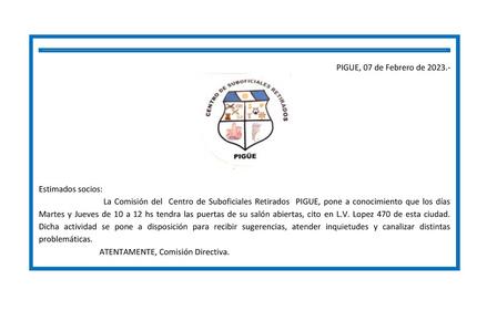 La Comisión Directiva del Centro de Suboficiales Retirados de Pigüé confirmó que los días martes y jueves, de 10.00 a 12.00 horas, estará abriendo las oficinas de su salón.