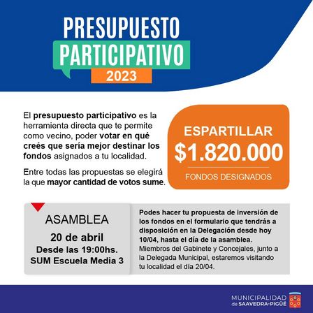 Esta nueva edición del Presupuesto Participativo estará orientando, a Espartillar, la suma total de 1.820.000 pesos.