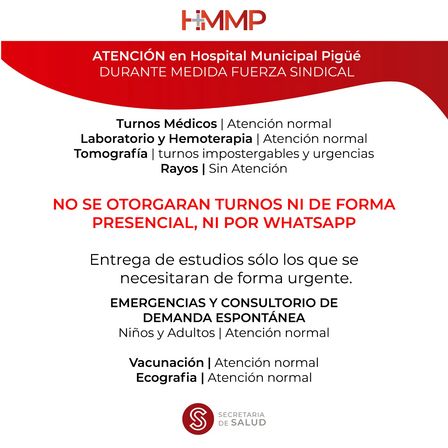 En el Hospital Municipal de la ciudad de Pigüé los turnos médicos tienen atención normal al igual que en Laboratorio y Hemoterapia, mientras que, en Rayos no hay atención, y en la Sección de Tomografías se atienden los turnos impostergables y las urgencias.
