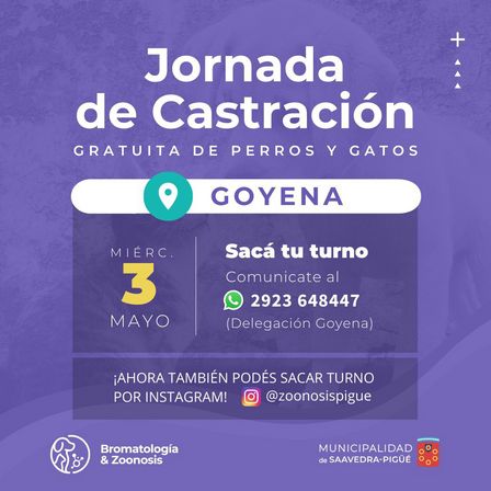En la Delegación Municipal de Goyena, el miércoles próximo, habrá castración gratuita de mascotas.