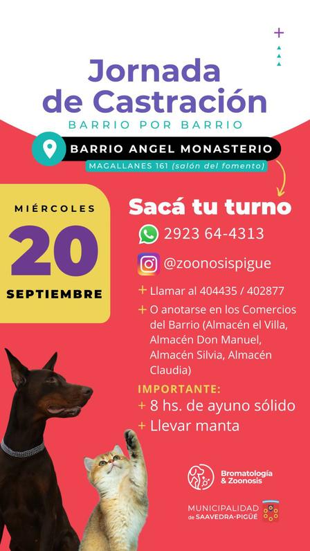 El Área de Bromatología y Zoonosis se hará presente la semana próxima, el miércoles 20 de septiember, para realizar las castraciones gratuitas