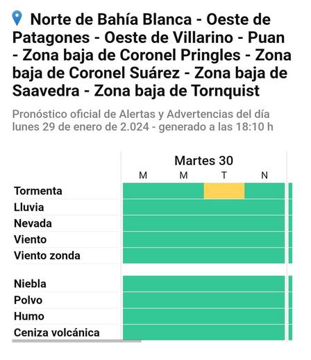 A través de un informe el Servicio Meteorológico Nacional indica que “el área será afectada por tormentas, pudiendo ser algunas fuertes. Las mismas podrán estar acompañadas por abundante caída de agua en cortos períodos y de manera local, actividad eléctrica frecuente, ocasional caída de granizo y principalmente ráfagas intensas.