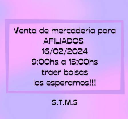 El Gremio de los Trabajadores Municipales estará llevando a cabo la venta de mercaderías para afiliados en la sede de calle 25 de Mayo 455 de la ciudad.