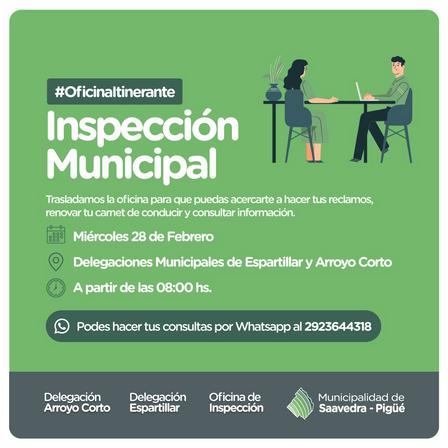 Los vecinos que deseen acercarse podrán llegar con sus inquietudes a las Delegaciones Municipales, o bien por Whatsapp al 2923 64 43 18, para que los inspectores puedan dar respuesta a las consultas en el día de la fecha.