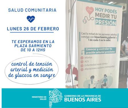 En el espacio público céntrico de la ciudad los integrantes del Equipo de Salud Comunitaria local estarán realizando testeos de tensión arterial y mediciones de glucosa en sangre.