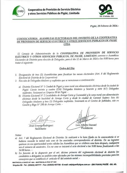 El Consejo de Administración de la Cooperativa de Provisión de Servicio Eléctrico y otros Servicios Públicos de Pigüé Limitada convoca a asambleas electorales de distrito para la elección de delegados.