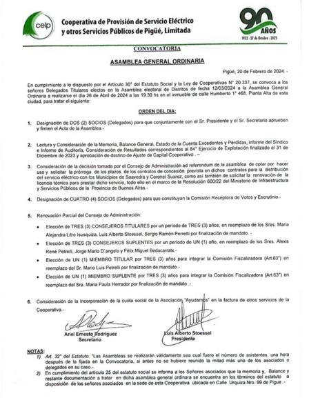 La Cooperativa Eléctrica de Pigüé convoca a Asamblea General Ordinaria