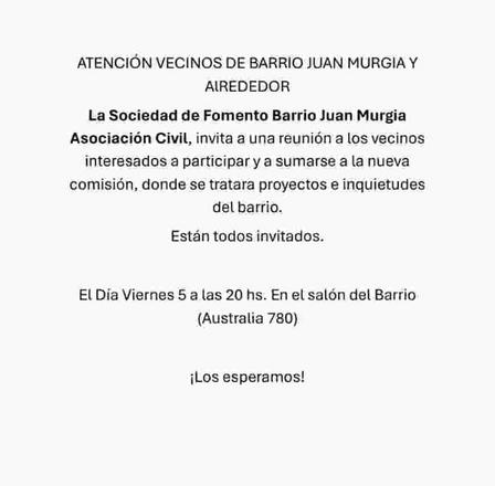 La Sociedad de Fomento del Barrio Juan Murguía de la ciudad está convocando a los vecinos de ese sector a participar de una reunión que tendrá lugar este viernes.