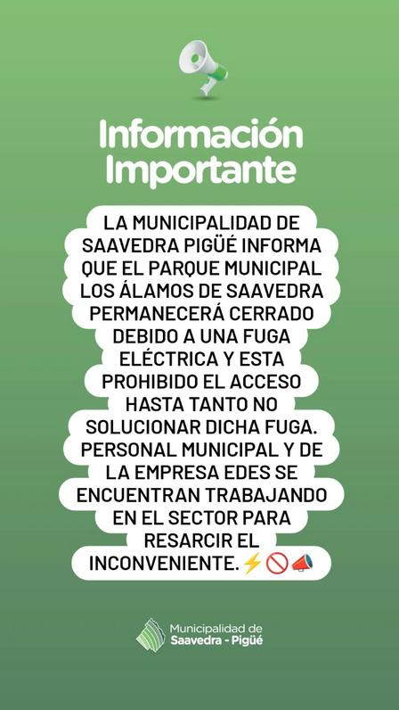 La Municipalidad de Saavedra Pigüé confirmó que el Parque Municipal Los Álamos de Saavedra permanecerá cerrado debido a una fuga eléctrica.