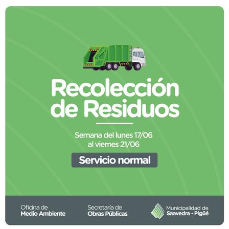 La Secretaría de Obras y Servicios Públicos, en un comunicado, expresó "que la recolección domiciliaria de residuos se realizará de manera normal durante la semana del 17/6 al 21/6.