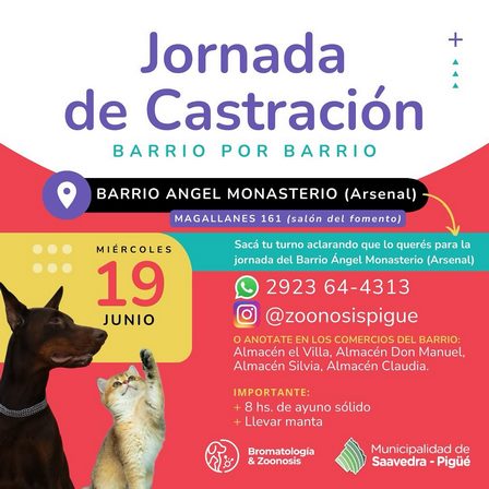 Mañana, miércoles, 19 de junio de 2024, por la mañana, habrá castraciones de mascotas en el salón de la Sociedad de Fomento del Barrio Ángel Monasterio.
