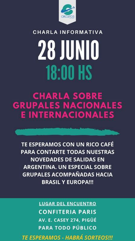 Se trata de charla informativa sobre las salidas grupales nacionales e internacionales, a través de una convocatoria abierta, donde podrán conocerse nuevas propuestas, destinos, y sus detalles, a cargo de Circuitos Viajes y Turismo.