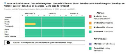Para el área bajo alerta de La Pampa, se espera una rotación de vientos al sudoeste a partir del jueves 27”.