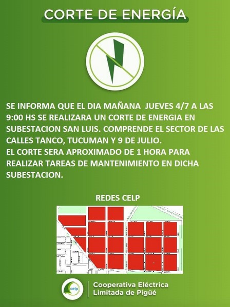 En Pigüé, este jueves, 4 de julio de 2024, tendrá lugar la interrupción del suministro de energía eléctrica, en la zona comprendida por las calles Tucumán, 9 de Julio y Ruperto Tanco.